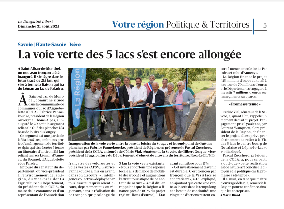 Dans le cadre de la voie verte des 5 lacs, inauguration le 29 août du prolongement de cette voie sur 3 km côté ouest du Lac Aiguebelette. En présence du Président de la Région, maire de Novalaise, maire de Nances et St Alban de Montbel. et du CODEP de l'AF3V.